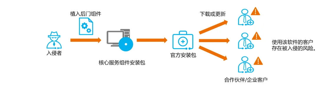 供应链攻击时攻击者针对供应链发起的网络攻击,并通过供应链将攻击延伸至相关的合作伙伴和企业用户。