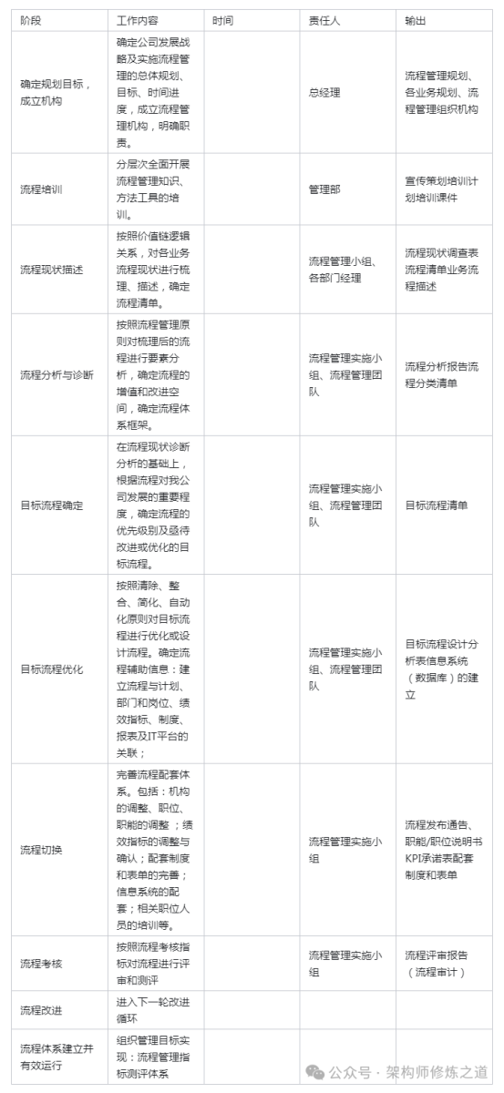 流程体系:建立清晰的流程体系是流程管理的切入点和重要目标。流程体系包括:流程分类清单、业务流程描述、流程要素分析与诊断、流程优化、流程切换、流程改进。