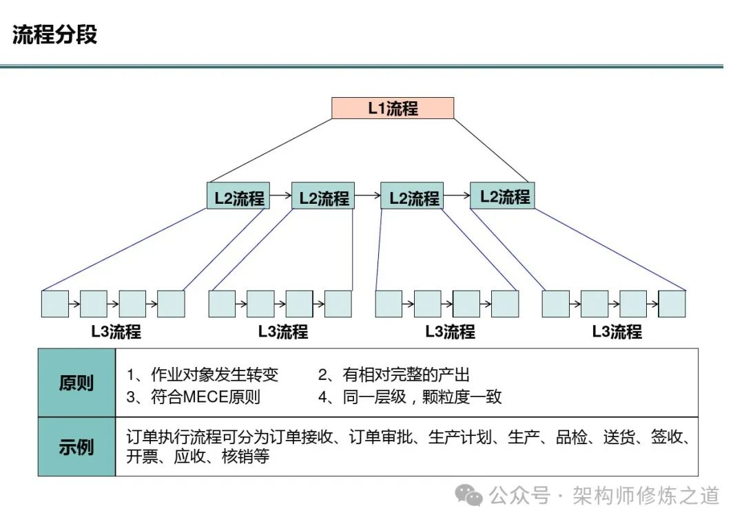 在进行流程分级时需要注意以下几个方面, 一是严格的自上而下, 每个上一 级流程都要完整地包含所有的下一级流程, 不存在跨越多个上级流程的下一级流程;每一个下级流程都是对上级流程的分解;二是不同频次的工作要分开, 例如 年度计划、月度计划和周计划, 虽然都是计划流程, 但需要建立不同的流程;三 是流程的边界要清晰, 各级流程的边界应该清晰, 并且具有有效输出, 根据流程 颗粒度划分的不同, 产出可以是阶段性产出, 也可以是端到端产出;四是通用流 程模块化, 有些流程是与其他很多流程通用的, 这些流程最好模块化, 以方便调 用, 同时也可以提高流程设计的效率和柔性。例如某个公司的合同管理流程都是 一样的, 在不同的流程中涉及合同管理的流程就调用该流程即可。不必再重复描述。(2)流程分段