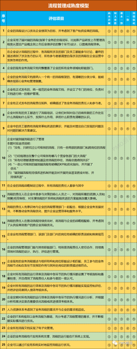 流程体系建设的好坏往往不容易衡量,流程管理成熟度模型就应用而生。作为PMO和项目经理,提升公司的流程管理成熟度是非常重要的一份职责,如何对企业流程进行成熟度调研是是需要方法的。今天分享给大家一个流程成熟度评估方法,该评估体系从流程的设计、流程的执行、流程的管理、人力资源支撑、IT系统支撑这5个维度25个客观性问题,对企业的流程管理成熟度进行调研。