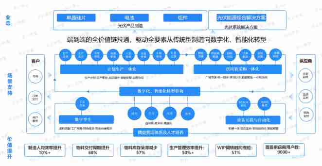通过企业全价值链数字化的持续建设,隆基股份实现了从传统制造向数字制造的转型,大供应链数字提效显著:人均制造效率提升超过10%、物料交付周期提升68%、物料库存呆滞减少57%、生产管理效率提升超过50%、WIP(在制品)周转时间缩短57%、全品类全流程供应链实时联动在线,拉动9000多家供应商。