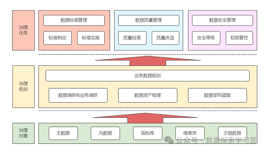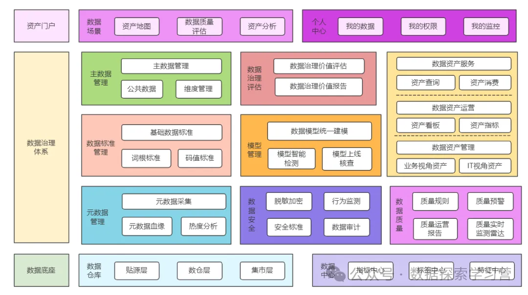 企业数据治理体系包括数据质量管理、元数据管理、主数据管理、数据资产管理、数据安全及数据标准等内容。
