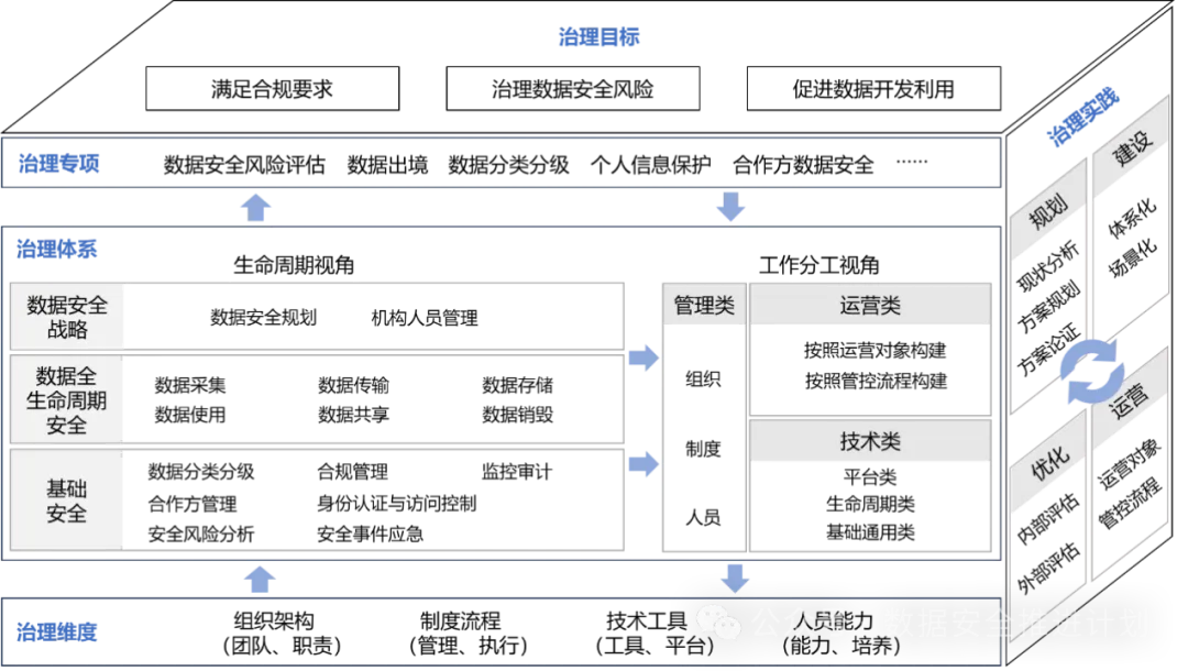 管理类工作涉及组织架构、制度流程、人员管理等三方面工作,是数据安全治理体系在组织内运作的基石,主要负责协调、整合及优化各种资源,最终实现数据安全治理目标。更详细的内容可以参考“(三)数据安全治理维度”。