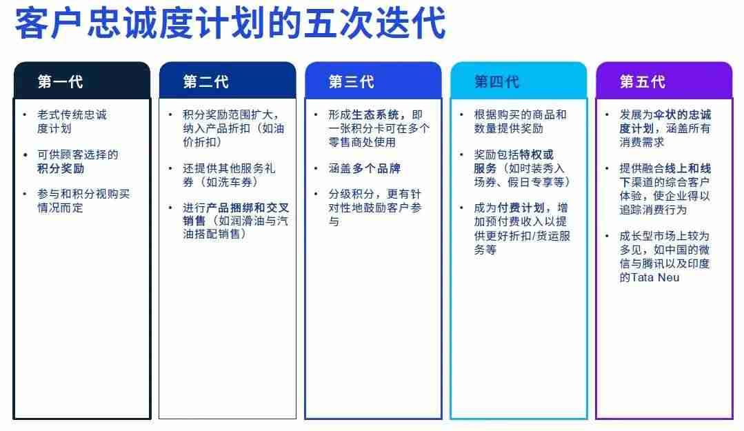 油气企业要在2030年后继续实现生存与繁荣,则需推进下游业务的多元化发展,而了解客户是其中的关键所在。客户忠诚度计划是获取客户数据、建立客户关系、提升交叉销售和客户忠诚度的有效途径。当前,大部分油气企业的忠诚度计划仍属第一代或第二代计划,然而第五代客户忠诚度计划早已发生显著变化。
