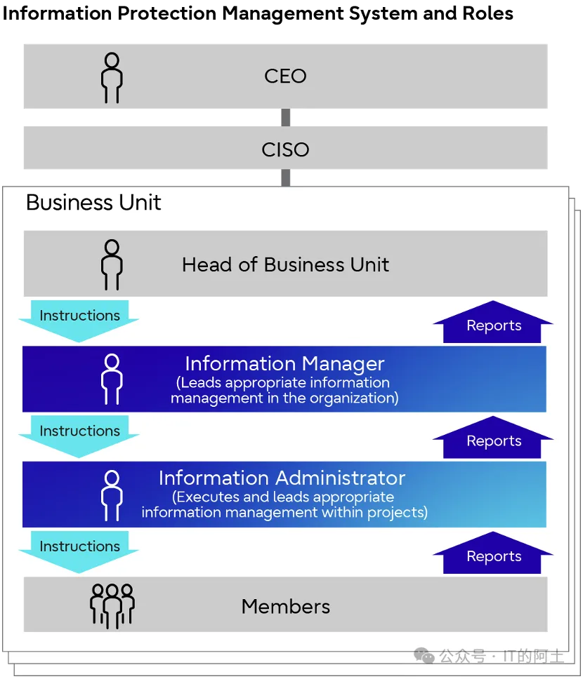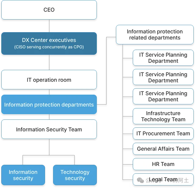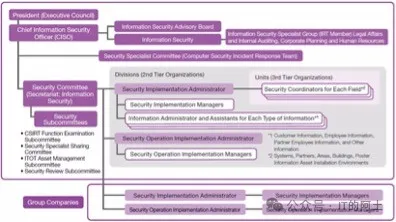 在首席执行官的领导下,构建以 CISO 为中心、由首席执行官监督的全球网络,以管理和保护信息。各部门任命管理人员,明确职责,促进信息的妥善处理。