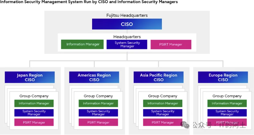 富士通集团于2021年10月任命了专门的首席信息安全官(CISO)。在日本和三个国际地区(美洲、欧洲和亚太地区)设立了区域首席信息安全官,以实施全球一致的安全政策和措施。它们使总部的政策与每个国家/地区的特定安全要求保持一致,以通过我们的全球集成系统加强信息安全。通过指派安全经理负责富士通总部及其集团公司国内外各部门的自主信息安全工作,加强CISO对相关部门的控制,以达到理想的信息安全状态。安全管理系统确保每个部门都有一名“信息经理”,负责监督信息的管理和保护;“系统安全经理”,负责监督信息安全系统的维护和管理;以及领导产品漏洞管理的“产品安全事件响应团队 (PSIRT) 经理”,以便他们能够与 CISO 合作推广各种信息安全措施。
