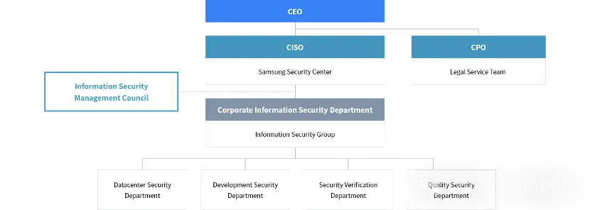 韩国三星SDS作为可持续发展战略中的关键数据安全策略,设置直接向CEO汇报领导安全中心的的CISO负责信息安全工作,设置向CEO汇报领导合规服务团队的CPO(首席数据保护官)保障数据安全合规。公司信息安全部门包含数据中心安全,开发安全,安全验证和质量安全部门。