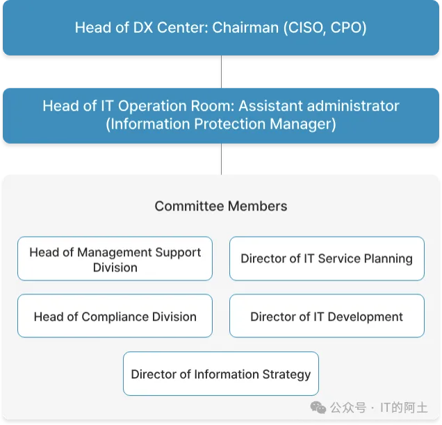 信息保护经理作为助理行政人员协助信息保护委员会负责人CISO承担IT运营管理工作,委员会的成员包括各相关部门经理,IT服务计划总监,合规部主管,信息战略总监。