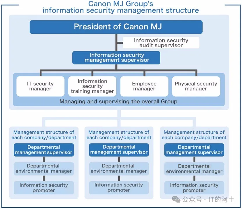 日本佳能日本营销,管理架构分为两部分,一部分负责集团信息安全的监管,另一部分负责各个公司/部门的信息安全。在集团的信息安全监管架构下,由集团总部职能部门规划、建议和推动集团的通用规则和措施,包括IT、物理和人员安全措施。各公司/部门的管理架构下,根据各公司或业务的特点,设立负责信息安全的部门或部门管理架构。同时,每个组织任命一名信息安全推动者,负责灌输规则和实施措施。