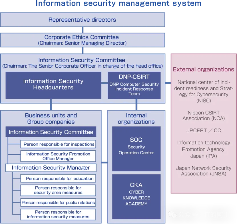 日本NDP成立了信息安全委员会和信息安全总部,作为全公司管理的监督机构,对业务部门和集团公司进行检查和指导。委员会主任由负责总公司的高级管理人员担任。此外,各事业单位和集团公司均设立了信息安全委员会,在委员长和个人信息管理负责人(以及各事业单位负责人)的指导下,处理以下事项:教育、安全领域措施和信息安全措施,并承担检查责任。自2015年起,海外集团公司设立了信息安全委员会。