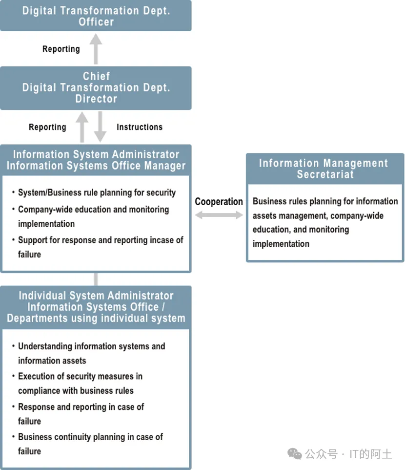 日产化学信息安全由首席数字化转型官负责,数字化转型官通过数字化转型总监指导信息化工作,信息安全管理员和信息系统办公室经理向数字化转型总监汇报,与信息管理秘书处协作规划系统和业务安全,进行意识教育和监控实施,支持报告和响应分支机构和部门的实践工作,具体的信息资产管理,信息安全合规度量,事件响应以及业务连续性由分支机构承担。