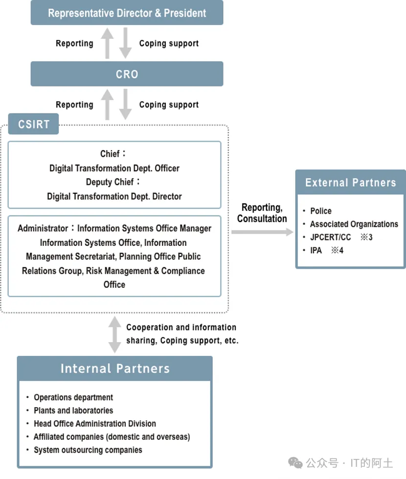 信息安全事件的处理,成立CSIRT(计算机安全事件响应小组),由数字化转型官负责,数字化转型总监辅助,具体管理部门包括信息系统经理,信息系统班管事,信息管理秘书处,计划办公室公共关系组,风险管理与合规办公室。负责向首席风险官汇报,并接受指导,对内协调运营部门,劳工部门,总部行政部门,关联公司,外包公司,负责对外向警方,关联组织,以及监管部门汇报。