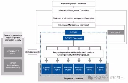 日本兄弟公司产品安全,B-PSIRT关注产品安全,遵循产品安全合规,产品安全事件处理,产品安全漏洞处理,执行预防策略,进行产品安全意识教育,通过产品安全开发流程与产品安全事件响应流程,实现产品安全信息公开和产品信息安全外部评估认证,通过第三方机构安全验证计划严格测试,遵守权威机构例如BMSec的安全计划。