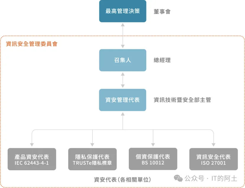 台湾Acer,「企业信息安全管理组织」,通过固定举办例会进行内部团队持续分享,并通过风险管理委员会,受董事长暨执行长(CEO)与董事会进行信息安全策略的监督,加速新政策布达与各单位意见沟通的机制建立。「企业信息安全管理组织」由全球信息技术总部主管(Head of Global IT)担任主负责人,并指派信息安全管理室负责制度管理推动与落实、企业信息安全室负责资通安全防护与强化作业; 并由各处总处长(或处长)担任信息安全管理组织委员(Committee),指派代表成立全球信息安全应变小组、ISO信息安全推动与执行小组、信息安全稽核小组及资通安全强化小组,持续精进内部信息安全管理。