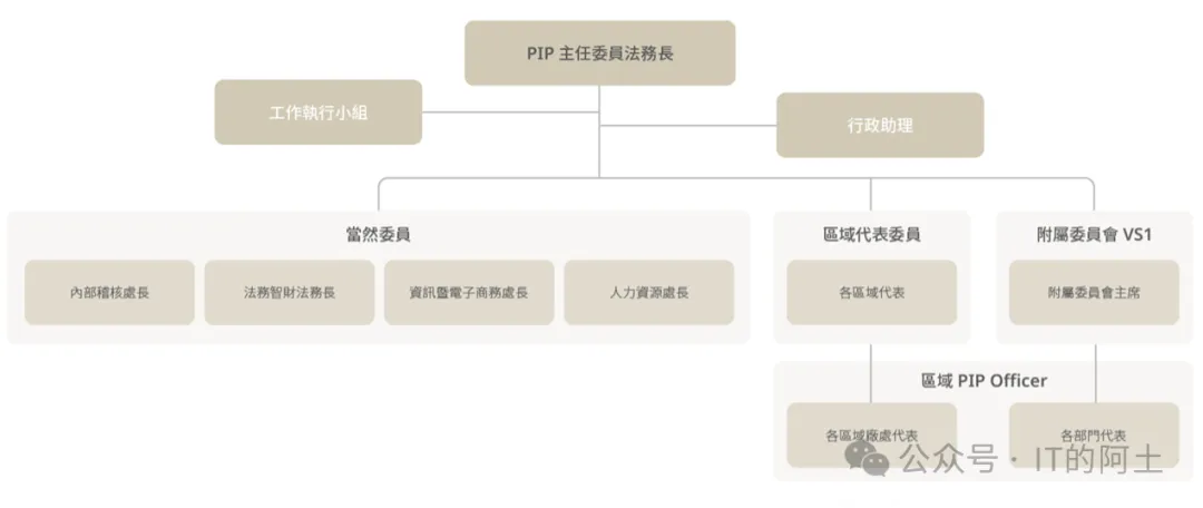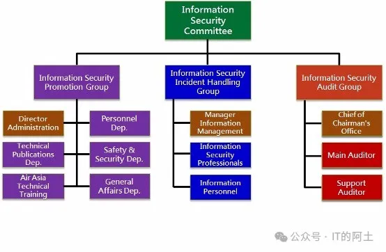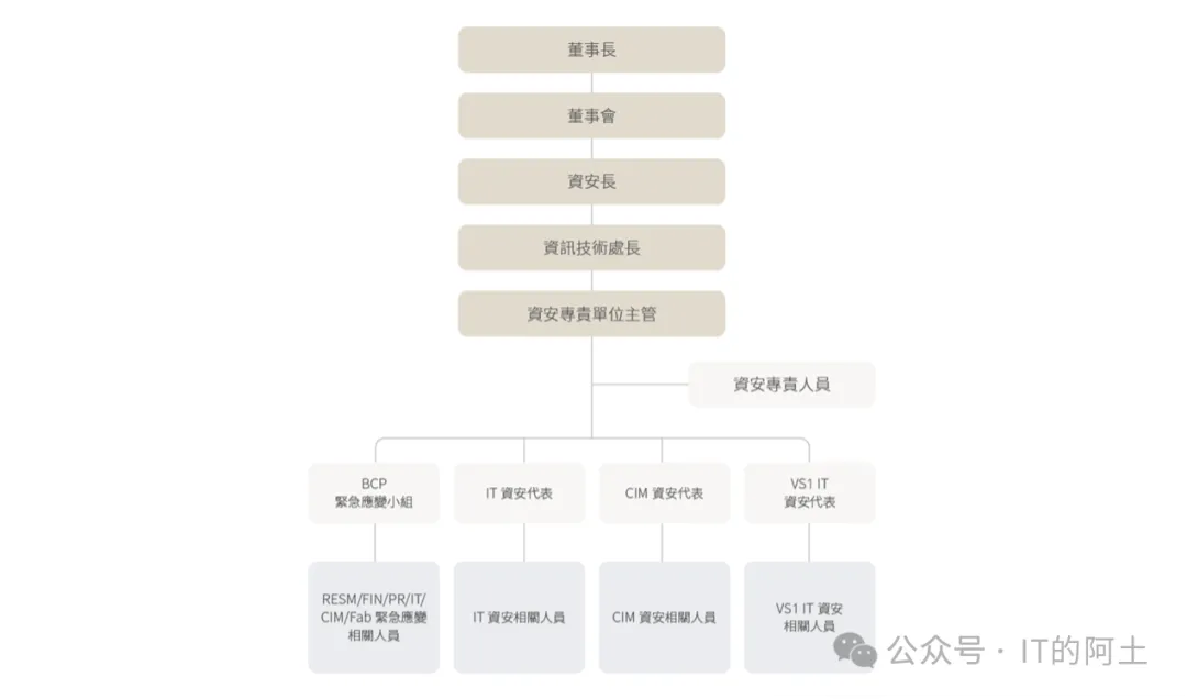 CISO向总裁(执委会)汇报,管理职能分为三部分,第一部分设计安全策略,管理各分支机构组成信息安全咨询理事会和信息安全专家组(包含合规,内部审计,企业规划和人力资源)。第二部分涉及安全事件响应,管理安全专家委员会(计算机安全事件响应团队),第三部分属于安全运营,由管理安全委员会(秘书处)对接二层组织安全实现管理,各子管理委员会包含CSIRT功能检查,安全专家共享,ITOT资产管理,安全回顾。