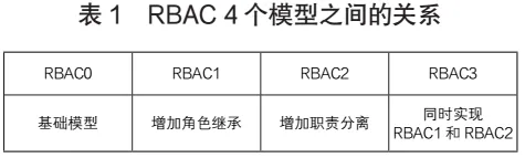 RBAC模型主要包含4个子模型,分别是RBAC0、RBAC1、RBAC2和RBAC3。这4个子模型合称RBAC96模型族,在1996年由拉维·桑德胡(Ravi Sandhu)教授在乔治梅林大学(George Mason University)任职期间提出。4个模型之间的关系如表1所示。