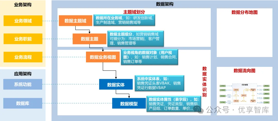 以企业业务架构和应用架构为输入,规划设计企业数据架构,主要内容包括数据主题域和主题划分,数据实体识别和企业级数据模型设计,数据流向梳理和数据分布地图绘制。