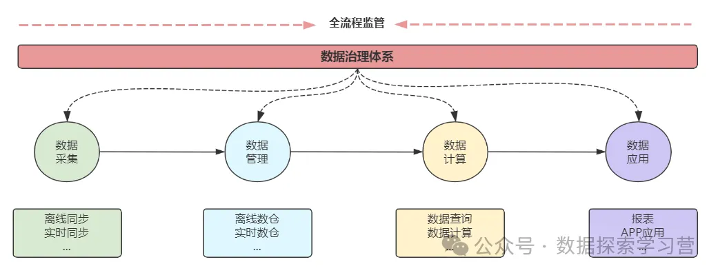 整体流程数据治理体系将全程监管。要确认进出系统的数据质量怎么样?是否可转化数据资产?数据血缘是否可追溯、数据安全等问题。