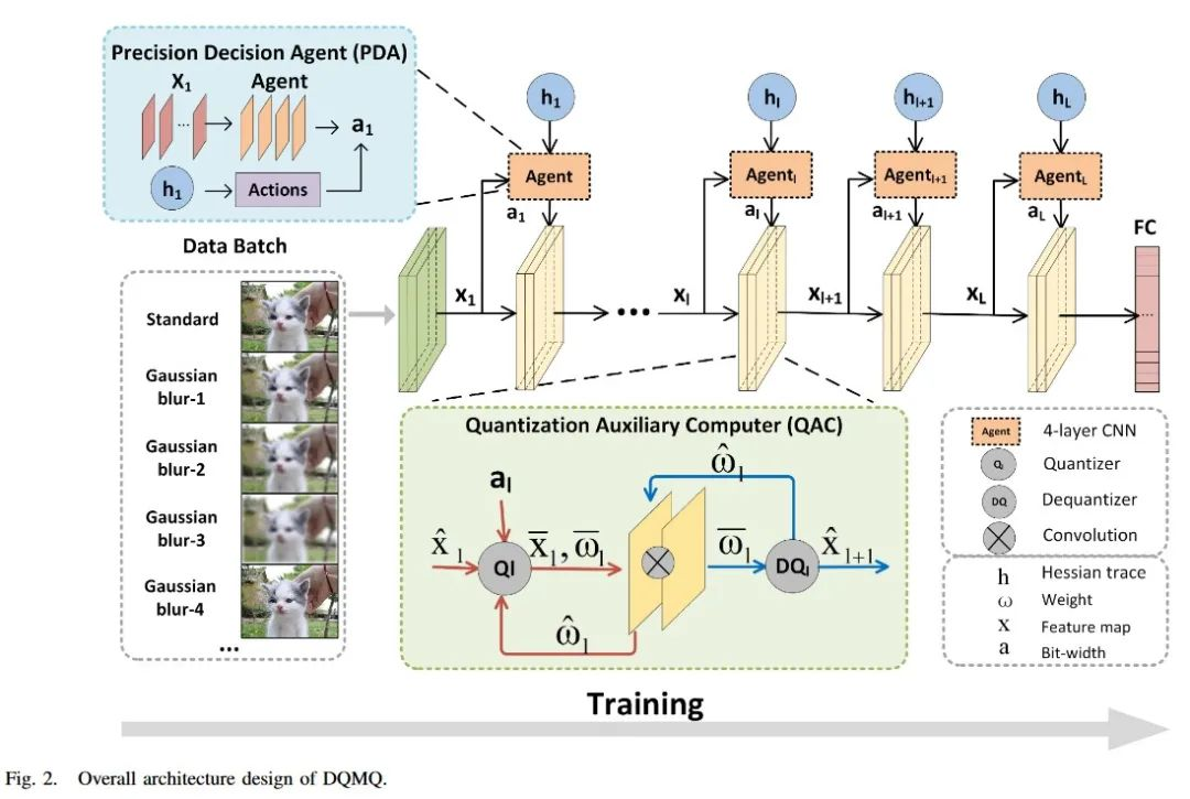 由于无差分位宽采样,混合精度量化在实际训练前大多预先确定模型位宽设置,获得次优性能。此外,传统的静态质量一致的训练设置,即假设所有数据在训练和推理过程中具有相同的质量,忽略了实际应用中数据质量的变化,这可能导致量化模型的鲁棒性较差。在本文,提出了一种新的数据质量感知的混合精度量化框架,称为DQMQ,以动态调整量化位宽以适应不同的数据质量。自适应是一种可以与量化训练联合学习的比特宽度决策策略。具体地,DQMQ被建模为基于模型的策略优化和有监督量化训练相结合的混合强化学习( RL )任务。通过将离散位宽采样松弛为连续的概率分布,并使用少量可学习的参数进行编码,DQMQ是可微的,可以直接进行端到端的优化,并同时考虑任务性能和量化收益的混合优化目标。在混合质量图像数据集上进行训练,DQMQ在面对不均匀的输入质量时,可以隐式地为每层选择最合适的位宽。在各种基准数据集和网络上的大量实验证明了相较于现有的混合精度量化方法,DQMQ具有优越性。