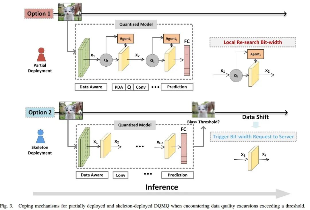 根据边缘移动设备的资源情况,DQMQ的部署可以分为三种情况:完全部署、部分部署和骨架部署。全面部署涉及在资源充裕的边缘设备上实现整个DQMQ框架,一个功能完善的DQMQ应用程序包含了一些功能进行量化位宽、参数量化和参数优化的决策;部分部署包括从框架中选择性地部署特定的模块;骨架部署是指在边缘移动设备资源极度匮乏的情况下,仅部署质量感知模块和量化模型骨架。