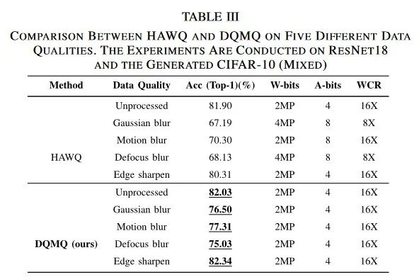 将本文提出的DQMQ与最典型的两阶段工作之一HAWQ – on ResNet18和CIFAR – 10进行比较。DQMQ结合了数据感知的位宽,从而获得了更高的预测精度。在锐化场景中也保持了精度的提升。与HAWQ相比,所提出的DQMQ具有显著的减少,最大位宽为2比特,激活位宽为4比特。