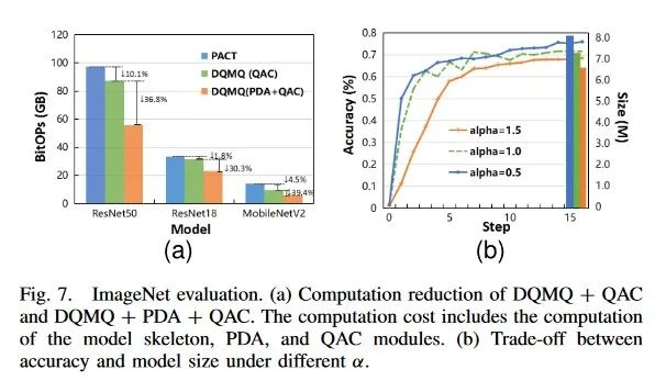 演示了DQMQ的计算量在不同部署中如何减少,并突出各种量化辅助模块。还说明了如何调整超参数α可以帮助DQMQ满足不同的精度和成本要求。
