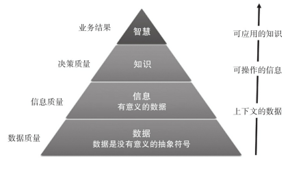在DIKW金字塔模型中,数据出于底层,在数据之上,是经过数据加工之后的形成的信息,即上下文的数据。在往上,我们将知识视为可操作的信息,并将顶级智慧视为可应用的知识。如果数据质量差,则信息质量将不佳。信息质量差,业务操作方面将缺乏可应用的知识,而使用错误的知识将对业务结果带来高风险。