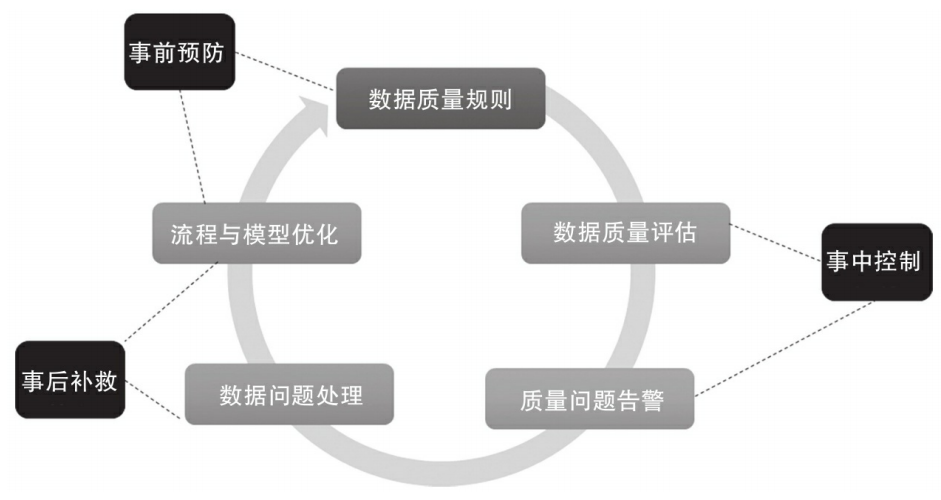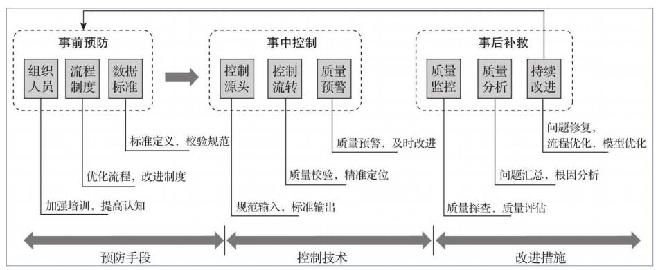数据质量管理包含正确定义数据标准,并采用正确的技术、投入合理的资源来管理数据质量。数据质量管理策略和技术的应用是一个比较广泛的范畴,它可以作用于数据质量管理的事前、事中、事后三个阶段。数据质量管理应秉持预防为主的理念,坚持将“以预控为核心,以满足业务需求为目标”作为工作的根本出发点和落脚点,加强数据质量管理的事前预防、事中控制、事后补救的各种措施,以实现企业数据质量的持续提升
