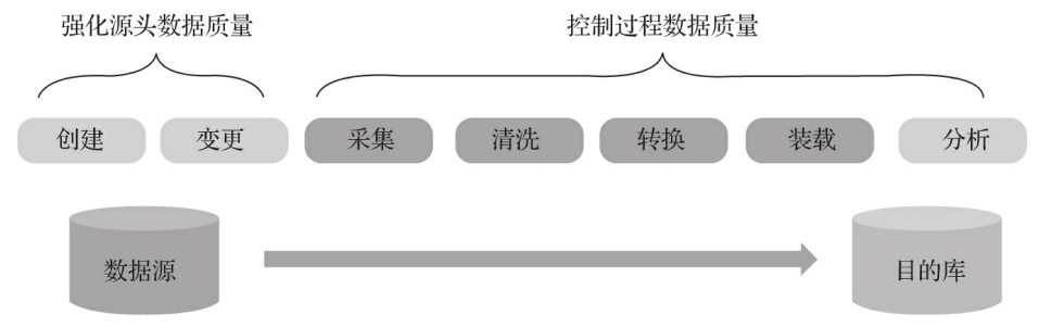 数据质量问题不止发生在源头,如果以最终用户为终点,那么数据采集、存储、传输、处理、分析中的每一个环节都有可能出现数据质量问题。所以,要对数据全生命周期中的各个过程都做好数据质量的全面预防。数据流转过程的质量控制策略如下。