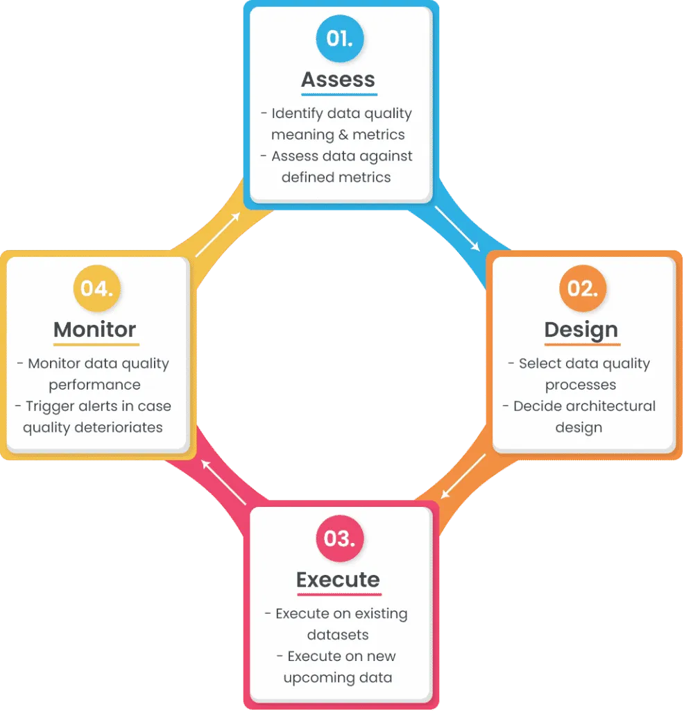 除了数据质量流程之外,在设计数据质量策略时要考虑的另一个重要方面是数据质量框架。这些过程代表用于消除数据集中数据质量问题的独立技术。数据质量框架是一个系统的过程,它持续监控数据质量,实施各种数据质量过程(按定义的顺序),并确保它不会恶化到定义的阈值以下。它提供了有关数据质量管理流程的更多详细信息。一个简单的数据质量框架包括四个阶段: