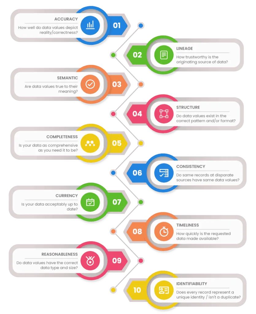 数据质量管理的第二个最重要的方面是它的测量。这些是数据特征和关键绩效指标,用于验证组织数据集中数据质量的存在。根据不同公司使用数据的方式,这些KPI可能会有所不同。我列出了最重要的数据质量维度及其代表的质量指标: