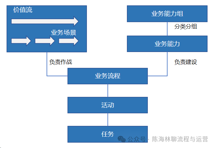 4. 【流程分级解耦设计】:公司价值流、业务能力是高阶层面的描述业务,如何落地呢?通过流程分级解耦设计,将公司价值流、业务能力,落到可执行的层面。流程分级通过自上而下层层分解,管理更精益化;流程分级通过自下而上层层支撑,管理更模块化。
