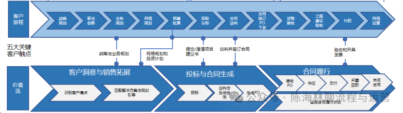 2)第二步:定义价值流企业要定义价值流,匹配客户旅程的关键活动。企业通过一系列增值活动,为客户创造并交付价值。这些连续的增值活动,是价值流阶段。价值流阶段通过连续交付,最终实现为客户交付完整的价值。价值流阶段划分应尽量与客户旅程的阶段划分相匹配,便于企业内部各个业务单位围绕明确的客户价值集成,实现合理分工和高效协同。客户从了解产品到使用产品的过程中,要与企业/渠道/终端发生多次互动,通过客户与企业/渠道/终端的接触点,向企业提出需求,获得成品/服务,反馈问题并得到解决。企业如何定义价值流,识别客户的旅程的关键触点,详见以下示意图: