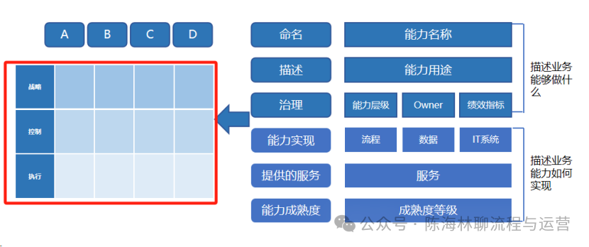 5)第五步:整合和重构业务能力企业通过价值流法、已有流程法、业务对象法等三种方法识别了业务能力。这些能力可能存在重复,能力边界也没有定义,企业需要对业务能力进行整合和重构。从多维度,多视角,多层次来整合和重构业务能力。首先,应关注业务能力颗粒度。企业在划分颗粒度时,需要综合考虑:业务能力的独立性、稳定性、综合管理性等因素。其次,应对能力进行分层分级。能力的划分方式有两种:第一种是按责任层级划分,分为战略,控制,执行,详见下图: