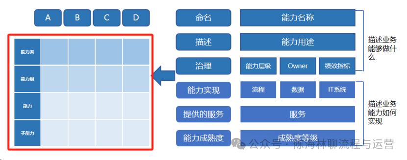 第二种是按照能力类、能力组、能力划分,根据企业业务规模,业务复杂度,可以划分到子能力,详见下图: