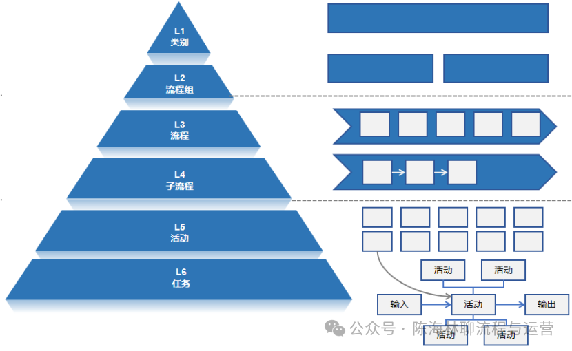6)第六步:流程分级设计流程是Y模型的支柱。价值流和能力是在宏观和高阶层面描述业务,业务流程将价值流和业务能力进行落地。定义流程的目的是为了成功的可复制性,以及规则的确定性,来应对企业环境的不确定性。流程数字化的前提是分级解耦。流程分级解耦的本质是将流程要素对象化,将带有线序的过程和可被编排的活动相对解耦。下图为流程分级示意图,特别提示,流程究竟分为多少级,不可以照抄照搬,应根据组织业务的复杂性,组织的规模,业务的价值等要素,进行分级。