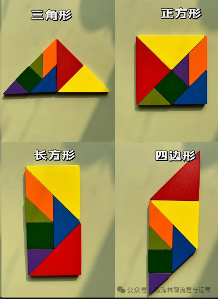 7)第七步:流程活动设计流程活动设计是流程分级解耦的关键。活动好比乐高积木的零件,而流程就好比用零件搭建起来的玩具模型。另外一个例子是七巧板,活动就像七巧板的七个构建块,通过这7个构建块,可以编排构建三角形,正方形,长方形,四变形等多种图形,这些编排好的图形,就好比业务场景,构建了不同的流程,供业务重复调用。