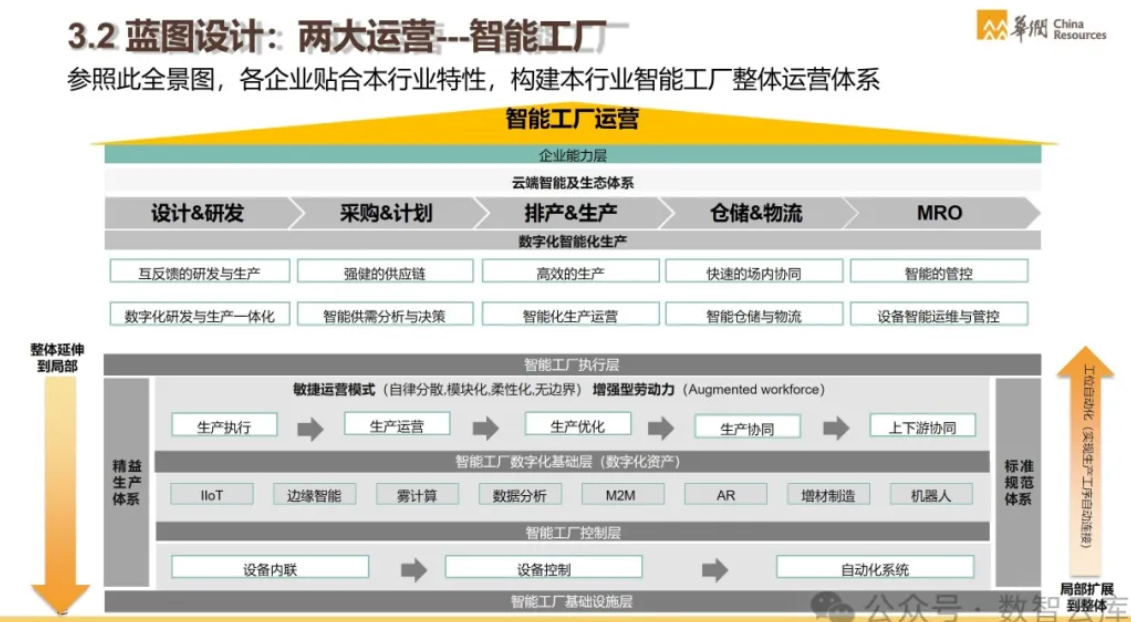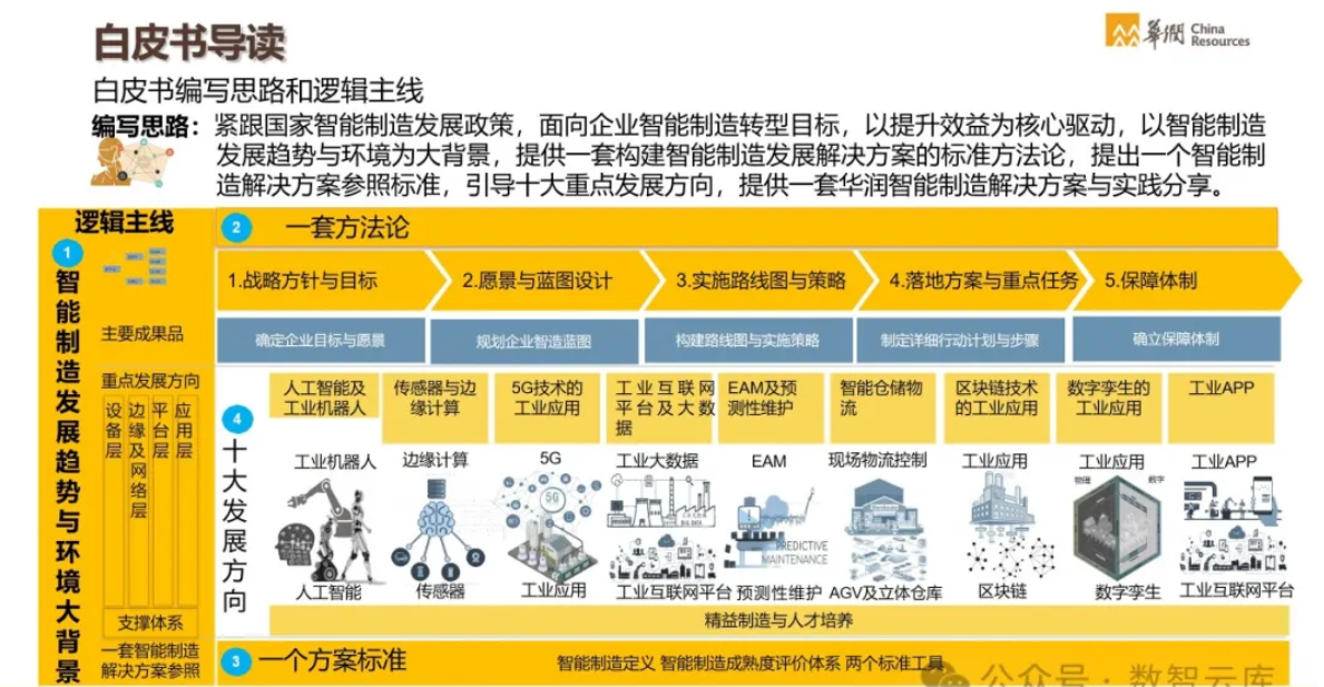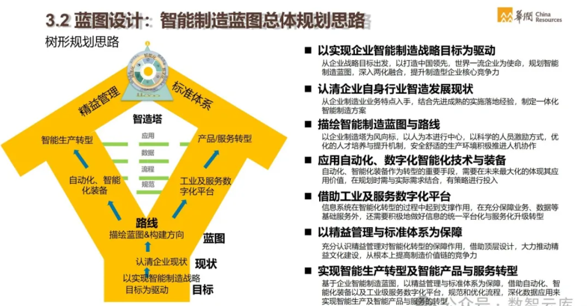 智能制造作为制造业转型升级的重要方向,涉及到一系列复杂的技术和管理创新。以下是对制造业智能制造方法论、整体蓝图规划、智能制造标准,以及华润智能制造解决方案及其实践分享的详细介绍: