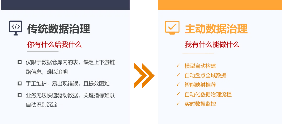 总结来说,传统数据治理是一种被动的治理方式,其特点是:你要什么我给什么,依赖人对原始数据的理解,因而容易导致数据治理效率低、工作量大、治理难度高的问题。