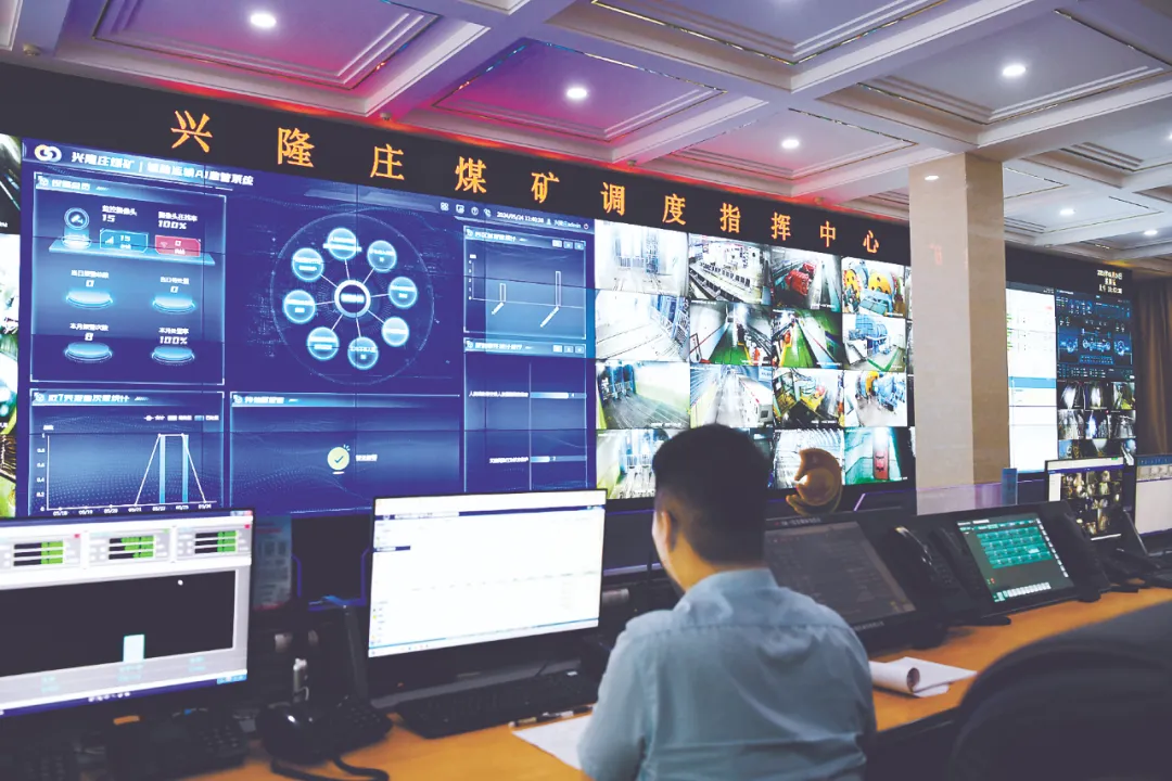 在兴隆庄煤矿调度指挥中心,分布在各个环节的摄像头采集到的画面被转换成一个个场景分专业显示在大屏上。