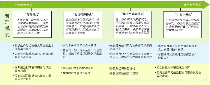 银行根据数据战略、自身组织架构特征,构建数据治理组织架构,其的分散和集中程度各有不同。组织管理分散且数据需求较少或复杂程度较低的银行,一般采用“分散模式”,各部门负责本领域的数据管理和应用;数据需求较多且复杂程度较高的银行,可采用“归口管理模式”、“集中+派驻模式”、“全集中模式”,具体选择哪种方式,在银行数据发展的阶段中同时也取决于归口管理部门的人力投入与专业能力,专业能力主要涉及组织沟通、业务理解、技术开发等方面。