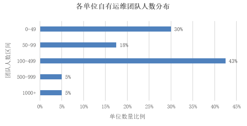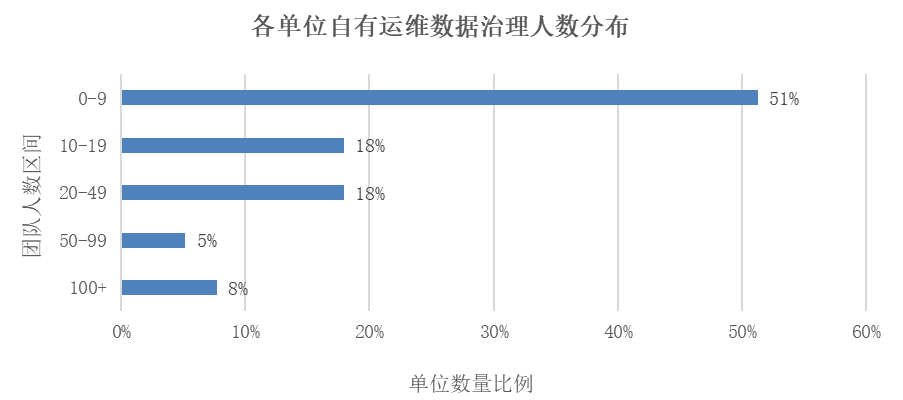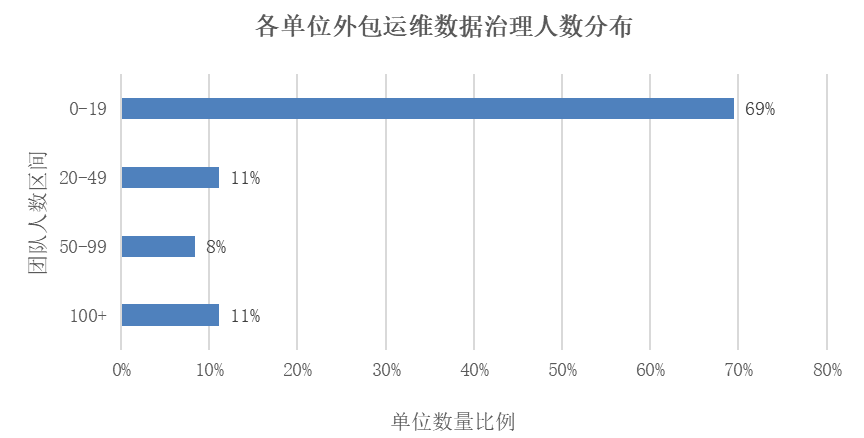 通过对运维人员、智能运维人员、运维数据治理人员和外包运维数据治理人员的调研,我们发现,43%的组织运维人数在100-499之间,55%的组织智能运维人员在0-19之间,而51%的组织运维数据治理人员在0-9之间,可以看出当前与智能运维有关的人员(包含运维数据治理的人员)在总人数中占偏低,这也反应出智能运维在多数组织内尚未全面应用,更多还是以某几个场景为切入点。通过以上数据也可以看出,组织在开展智能运维工作时多数会先选择运维数据治理。