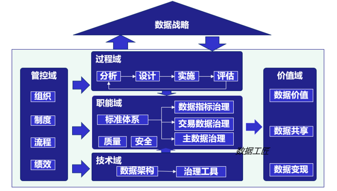 职能域:是数据治理的主体,明确数据治理的对象和目标。根据数据资产的构成,又分为主数据治理、交易数据治理和指标数据治理,包含数据标准体系、数据模型管理、数据质量管理、数据安全管理和数据治理组件。