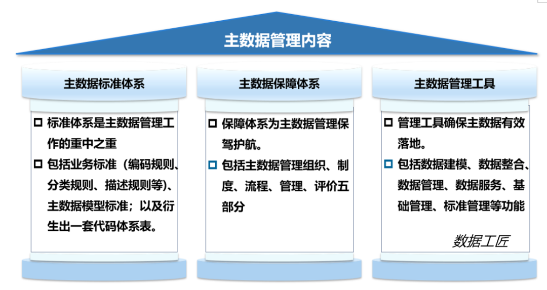 主数据管理的主要内容包括“两体系、一工具”,即主数据管理标准体系、主数据管理保障体系和主数据管理工具。其中,主数据管理标准体系是主数据管理工作的重中之重,主数据管理保障体系为主数据管理保驾护航,主数据管理工具确保主数据管理有效落地。