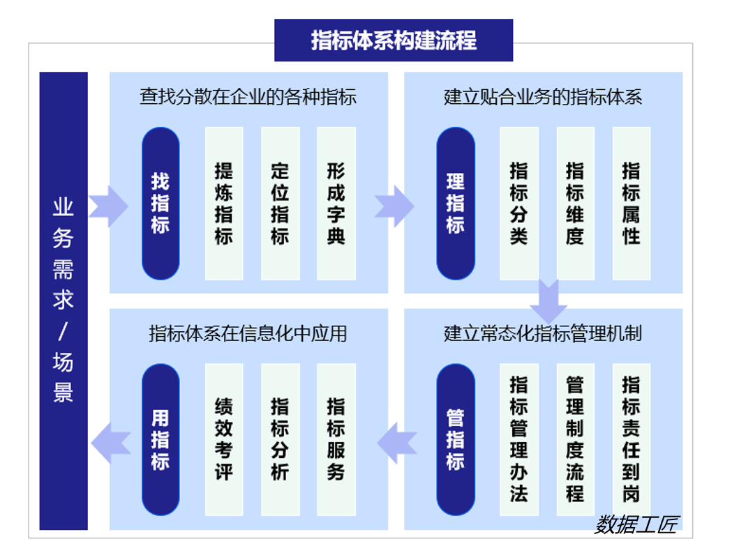 l 用指标:规划并建立指标体系在数字化中的应用。通过从多源异构系统中采集指标数据,经加工处理后形成主题域的数据集市,提供指标服务、指标分析,进行绩效考评,并加以持续改进。