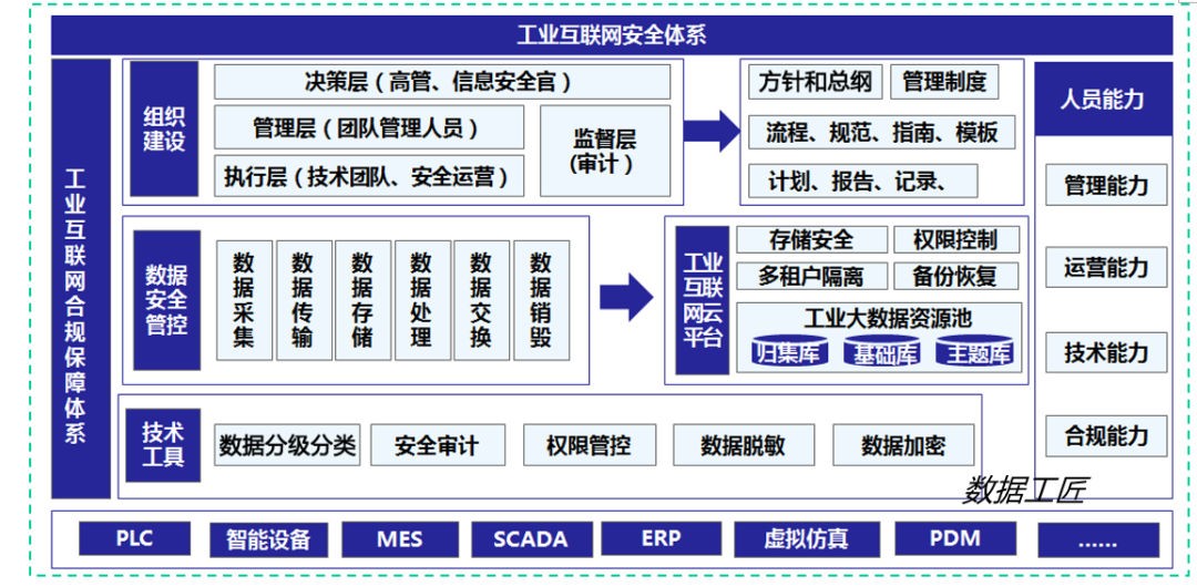 构建完整的工业互联网安全体系,是实施数据安全管理的重要保障。根据行业特点和管理要求,这里将工业互联网安全体系架构分为工业互联网合规保障体系、组织建设、数据安全管控、工业互联网云平台、人员能力、技术工具。 数据安全体系框架通过3个维度构建而成,包括政策法规、技术层面和安全组织人员。数据安全治理体系框架在符合政策法规及标准规范的同时,需要在技术上实现对数据的实时监管,并配合经过规范培训的安全组织人员,构成了数据安全治理整体架构的建设。