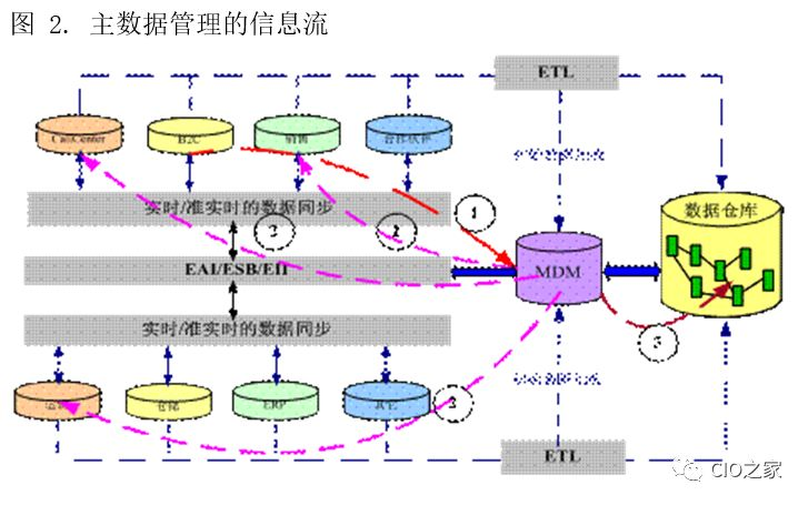 一般来说,主数据管理系统从 IT 建设的角度而言都会是一个相对复杂的系统,它往往会和企业数据仓库 / 决策支持系统以及企业内的各个业务系统发生关系,技术实现上也会涉及到 ETL、EAI、EII 等多个方面,如图 2 所示,一个典型的主数据管理的信息流为: