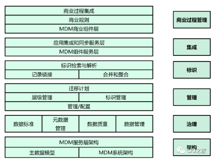 根据主数据管理实施的复杂程度,大体可以把主数据管理可以分为五个层次,从低到高反映了主数据管理(MDM)的不同成熟度。