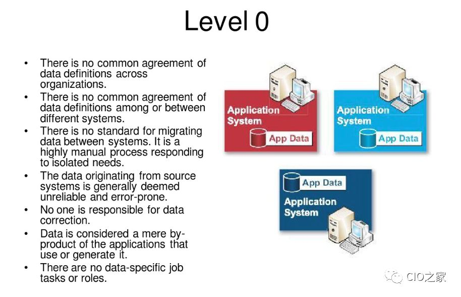 在Level 0的情况下,意味着企业的各个应用之间没有任何的数据共享,整个企业没有数据定义元素存在。