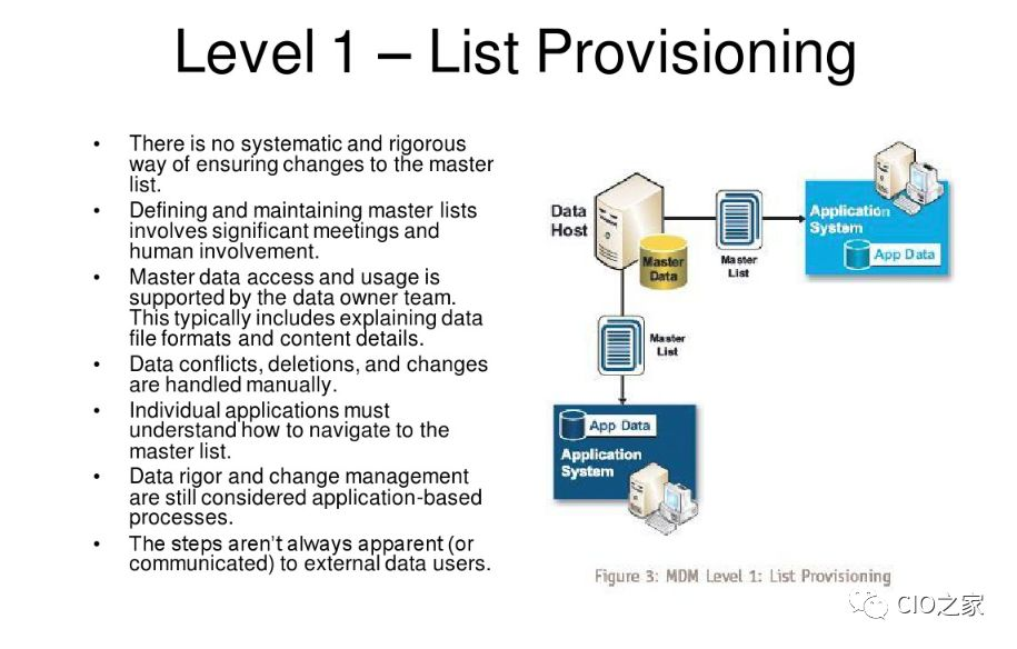 Level1比Level 0的不同就是,各个部门虽然还是独立维护各自的关键数据,但会通过列表管理维护一个松散的主数据列表,能够向其他各个部门提供其需要的数据。在Level 1中, 数据变更决定以及数据变更操作都是由人来决定的,因此,只有人完成数据变更决定后才会变更数据。